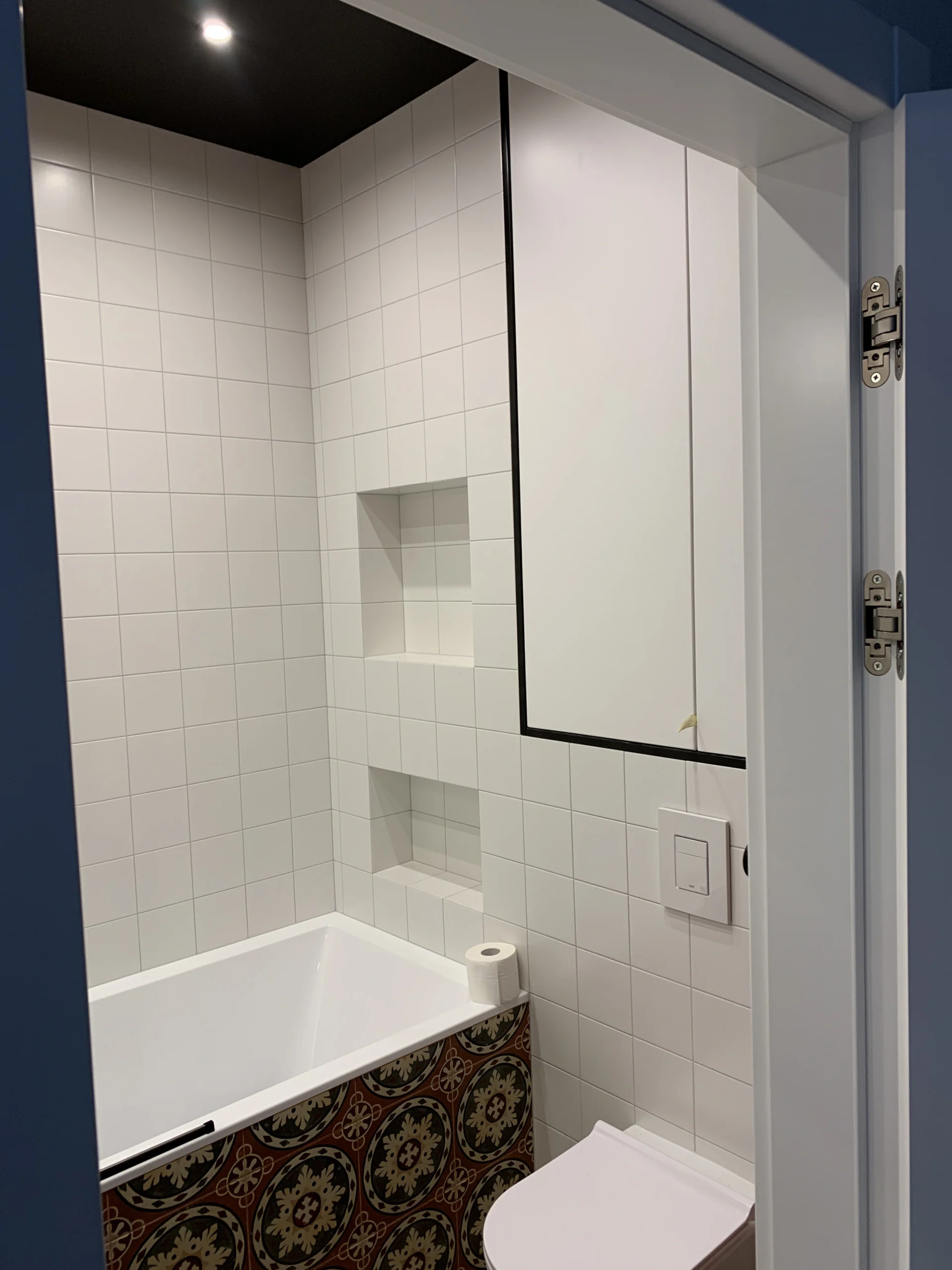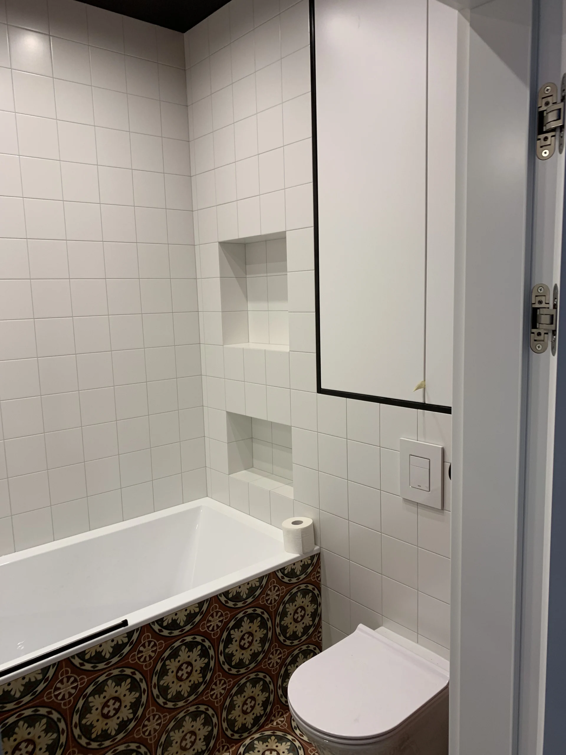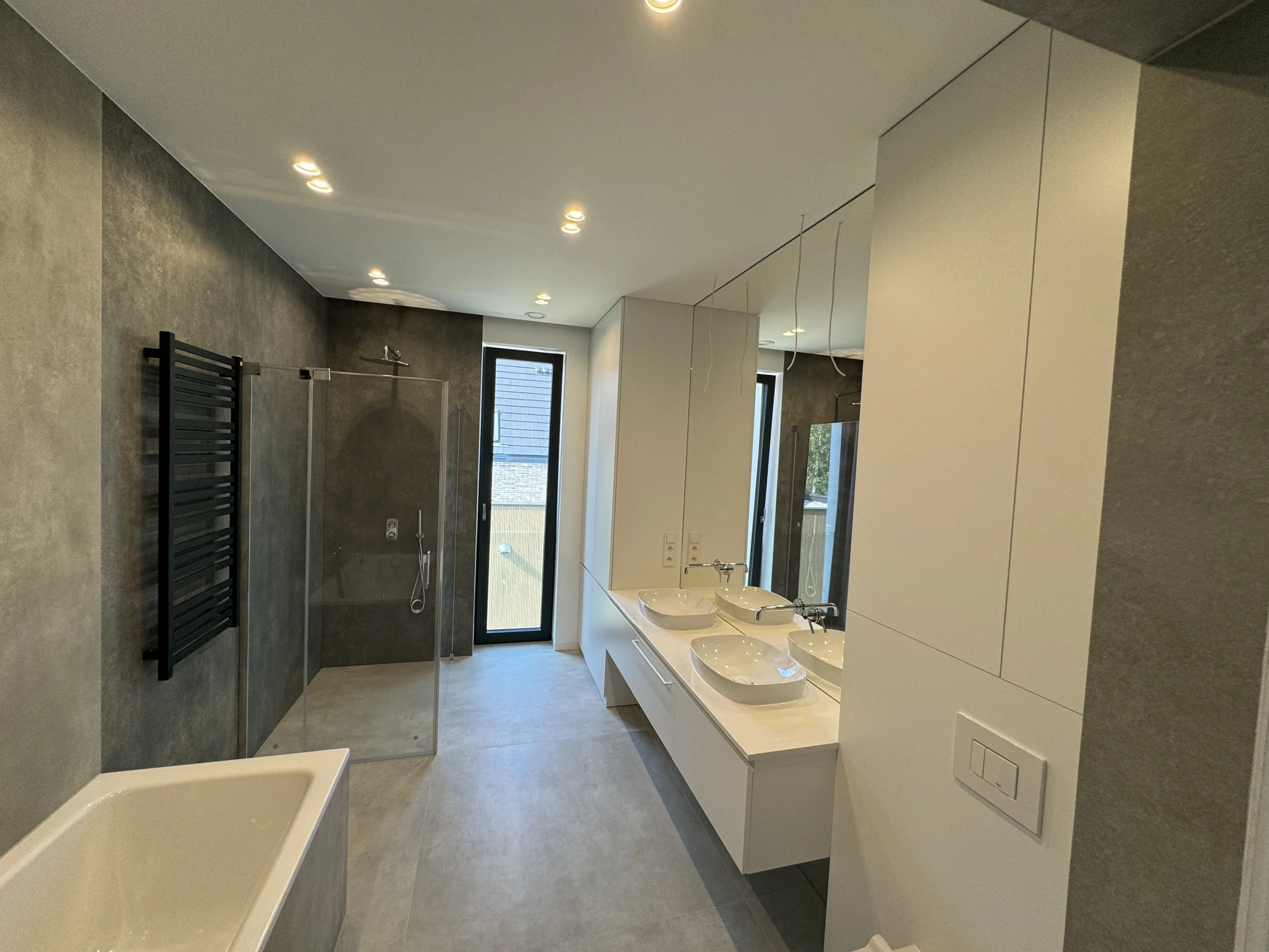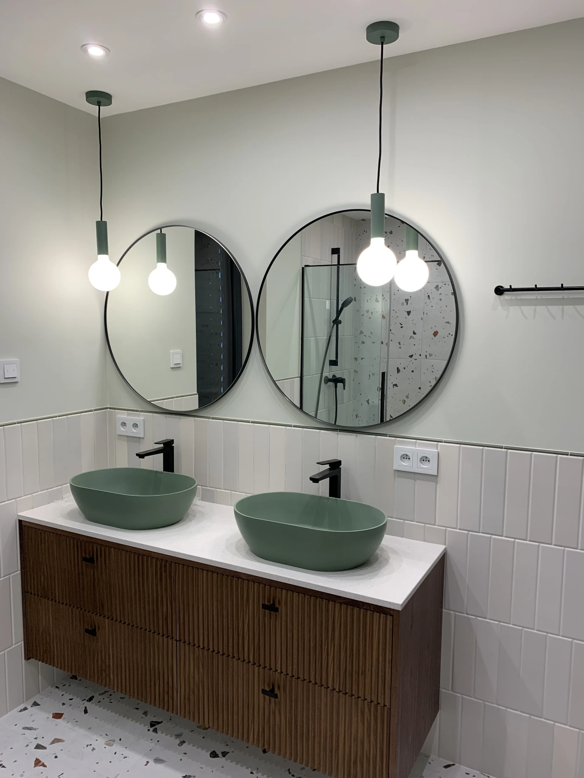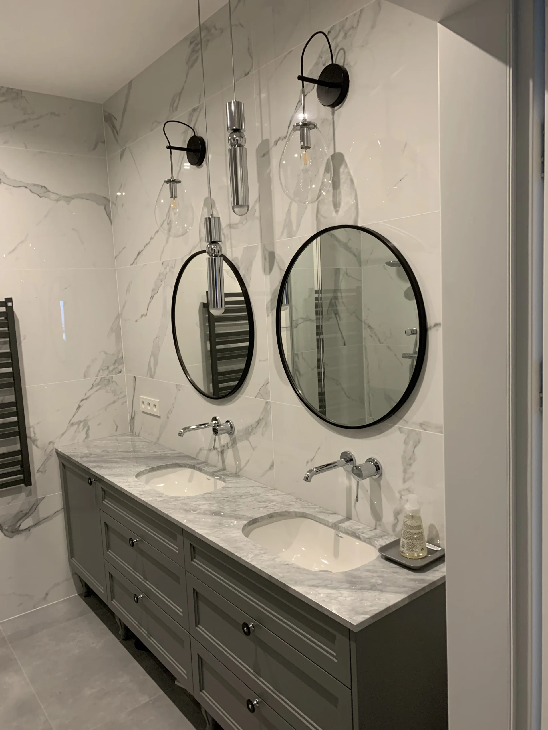 - Zabudowy łazienkowe: szafki podumywalkowe oraz zabudowy pralek i suszarek, które tworzą spójną całość z płytkami i spiekami.