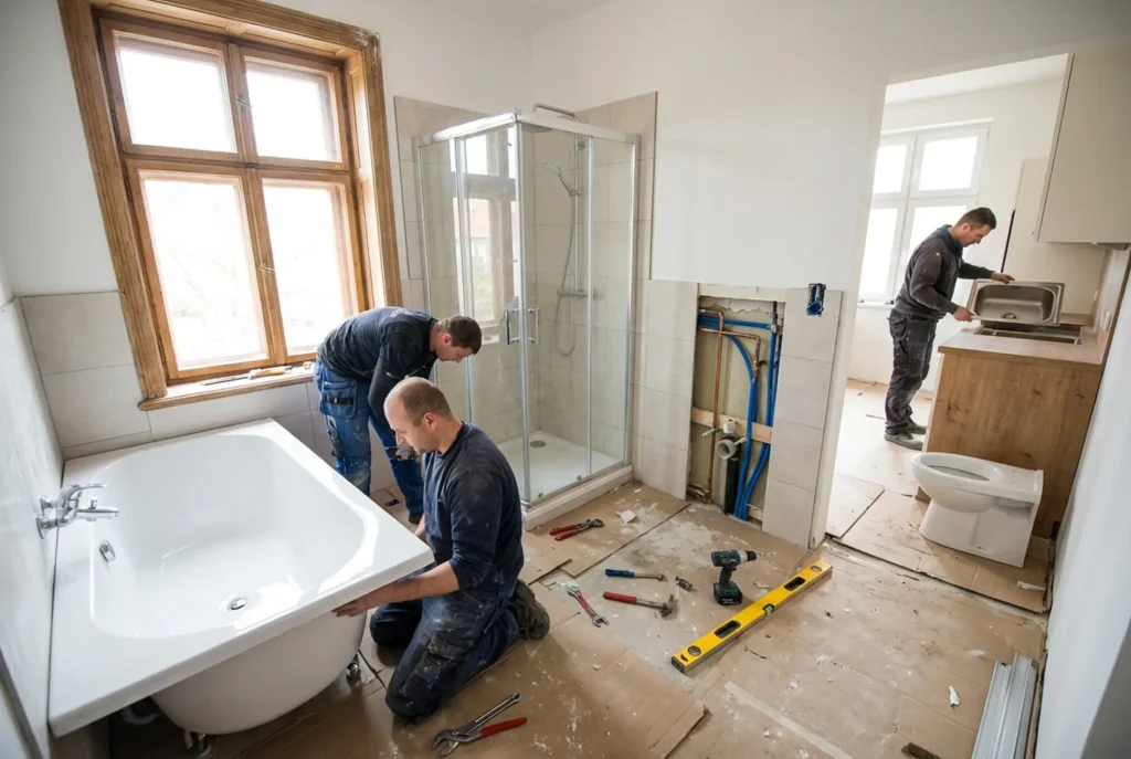 - Armatura i ceramika: Osadzanie wanien, montaż kabin prysznicowych, umywalek oraz baterii nawannowych i nablatowych.